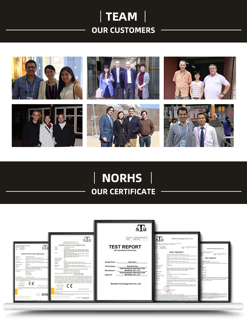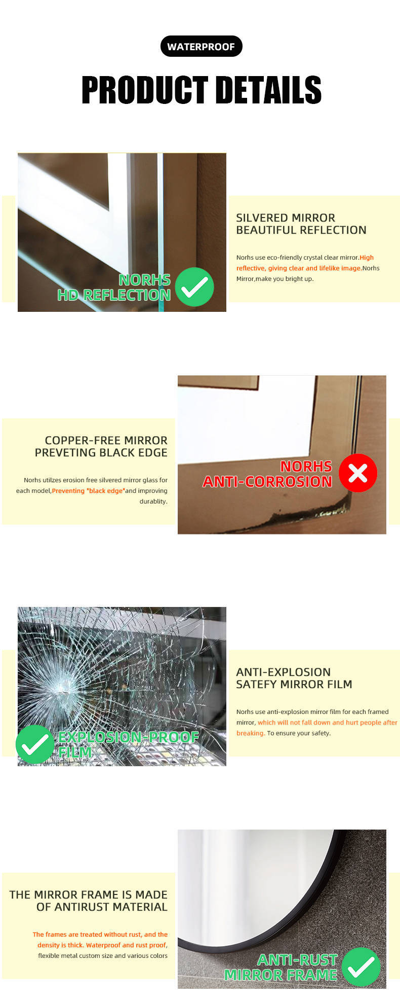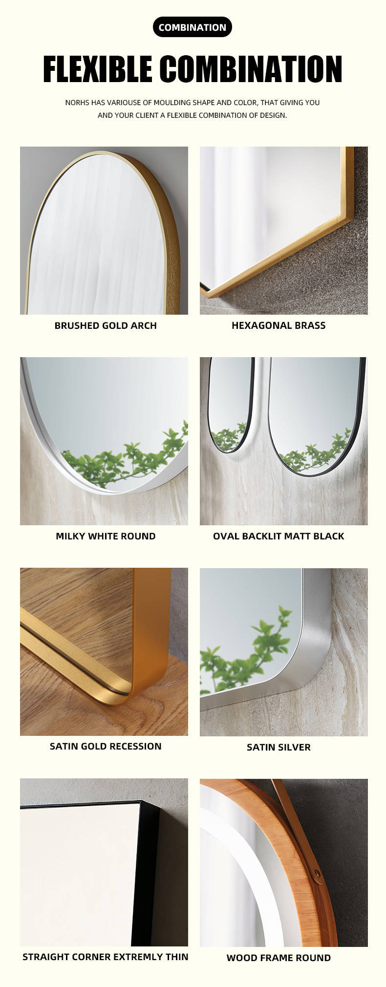 Optional Features: 1. Frame: Stainless steel framed mirror 201/304#2. Frame treatment: Electronical plate, Powder coated or Oxidation treatment available 3. Frame Color: Classic matt Black/ Miky white/Satin Gold/Silver/Antique Brass 4. 3/4mm Aluminum; 4/5mm silver; 4/5/6mm copper free silver 5. Antique Mirror, tinted mirror,frosted mirror,patterned mirror, acid etched mirror and glass back paint 6. Light: Option LED rectangular bathroom mirrors