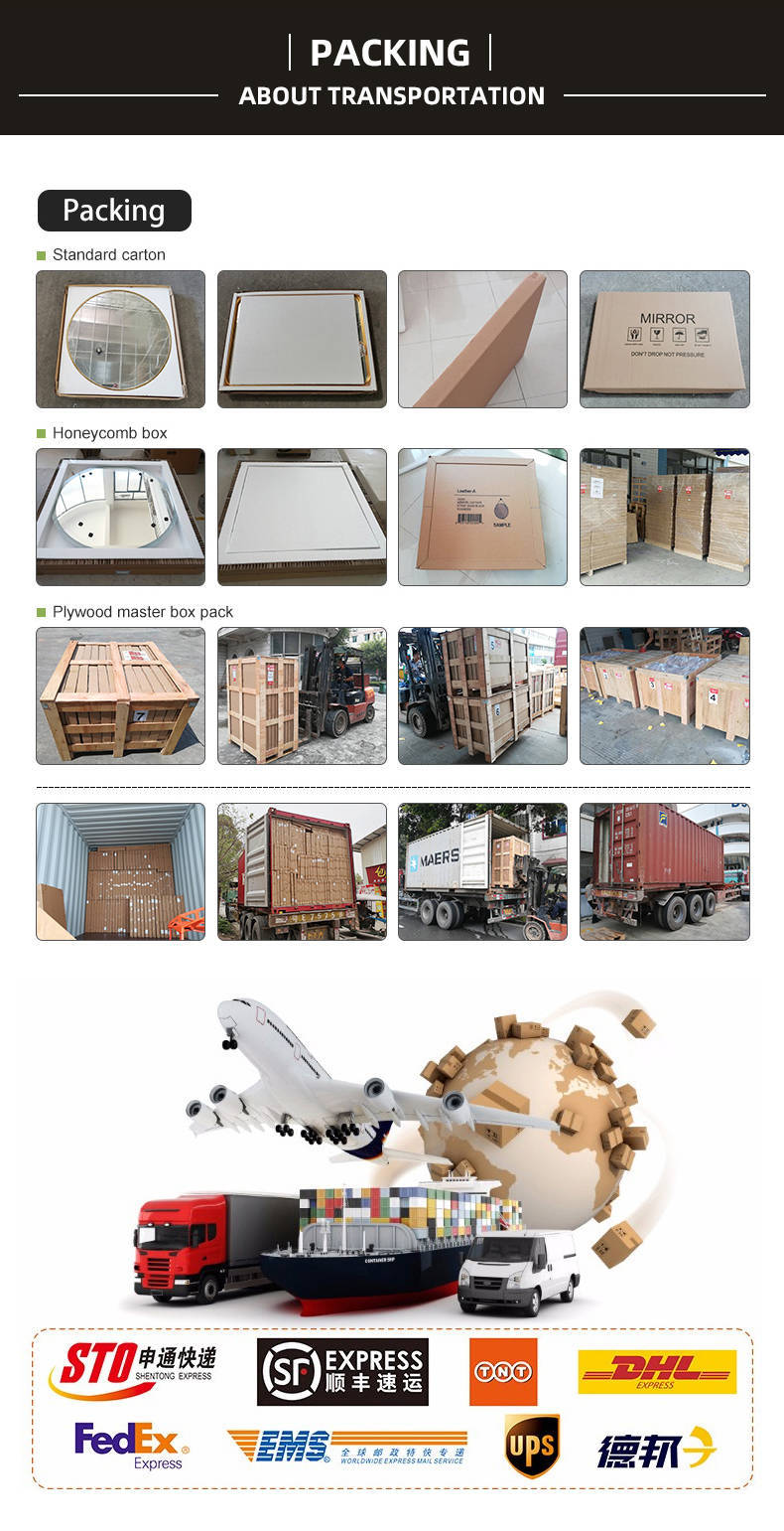 Packing: Standard packing for mirror: 6 side Strong Foam +Out carton, 1 pc/ctn; Optional Master carton Or Master export Plywood pallet available Optional Mailer package available